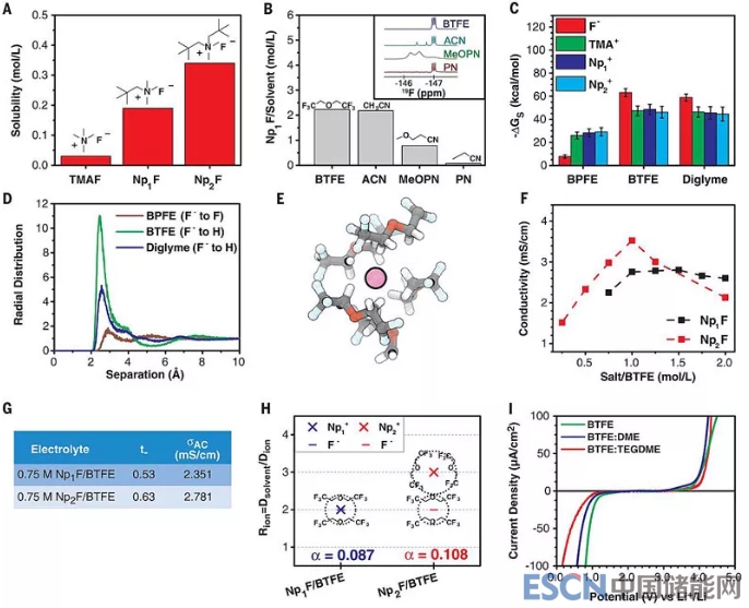 金屬氟化物電解質(zhì)鹽類普遍不溶于有機(jī)溶劑,有機(jī)氟化物電解質(zhì)鹽類盡管可以提高溶解性,然而這些鹽很難真正以無水形式被合成,容易發(fā)生分解(F-變?yōu)镠F2-),即便商用無水四甲基氟化銨(TMAF)在有機(jī)物中的溶解度依舊有限。研究者通過分子設(shè)計和實驗,選擇了新戊基取代的氟化銨(Np1F、Np2F,下圖A),發(fā)現(xiàn)新的氟化銨鹽不但在有機(jī)溶劑中的溶解度增加,同時β-H的減少也可以抑制干燥中有機(jī)氟化物的分解。將新戊基取代的氟化銨溶解在不同溶劑中,室溫下在氟代醚中的離子電導(dǎo)率表現(xiàn)優(yōu)異,可以與鋰離子電池電解液的電導(dǎo)率相當(dāng)。
