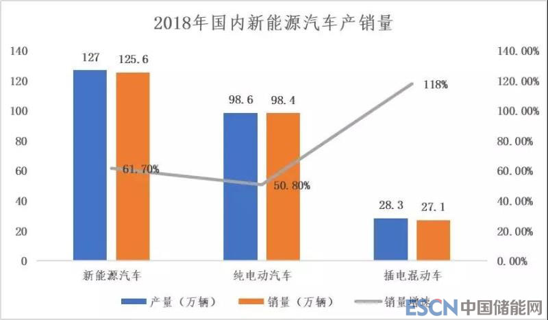 國(guó)發(fā)能研院、綠能智庫梳理數(shù)據(jù)表明,2018年全球新能源汽車銷售量超過200萬輛。截至2018年底,全球新能源汽車?yán)塾?jì)銷售量達(dá)到550萬輛,中國(guó)占比超過53%。2018年,我國(guó)新能源汽車(包含乘用車和商用車)產(chǎn)銷量分別為127萬輛和125.6萬輛,同比增長(zhǎng)59.9%和61.7%;純電動(dòng)汽車產(chǎn)銷分別完成98.6萬輛和98.4萬輛,同比增長(zhǎng)47.9%和50.8%;插電式混合動(dòng)力汽車產(chǎn)銷量為28.3萬輛和27.1萬輛,同比增長(zhǎng)122%和118%。其中,新能源乘用車占據(jù)總銷量的約75%,全年銷量超過100萬輛,新能源客車占比約17%,新能源貨車占比約7%。2018年,插電混動(dòng)車產(chǎn)銷量增速超過純電動(dòng)車一倍以上,銷量占比從2017年的約16%上升到2018年的21.6%,提升明顯。