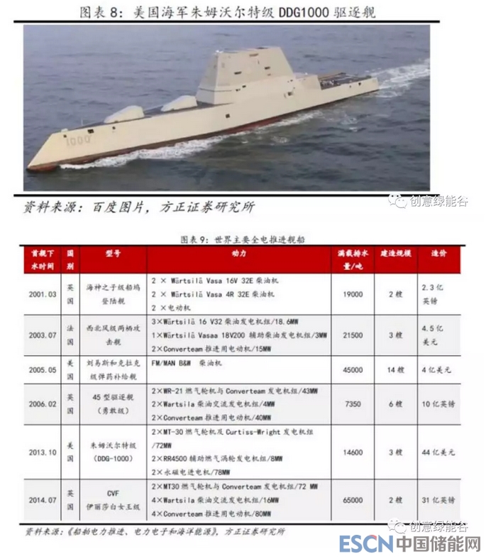 美國海軍在其05年下水的軍輔船劉易斯和克拉克級(jí)彈藥補(bǔ)給艦上驗(yàn)證了全電推進(jìn)技術(shù),并在其技術(shù)全面領(lǐng)先、被稱為科幻戰(zhàn)艦的新世代主力驅(qū)逐艦朱姆沃爾特級(jí)(DDG-1000)采用了全電推進(jìn)系統(tǒng)。其首艦已于2013年10月下水,滿載排水量超過1.4萬噸。