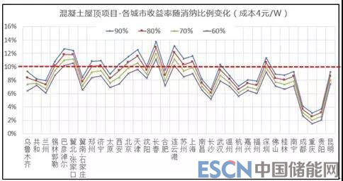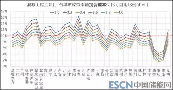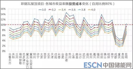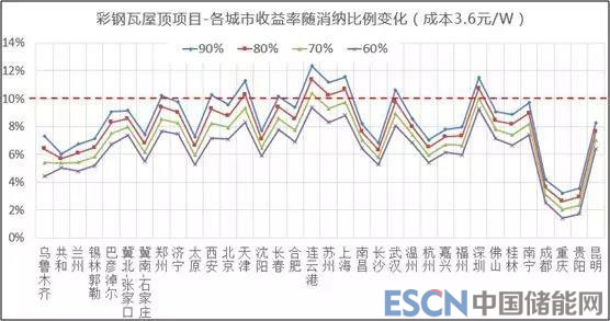 根據(jù)測(cè)算結(jié)果,對(duì)于彩鋼瓦屋面項(xiàng)目,初始投資成本為4.0元/W,以及消納比例在50%以下初始投資成本大于3.4元/W時(shí),幾乎沒(méi)有城市滿足收益率要求。