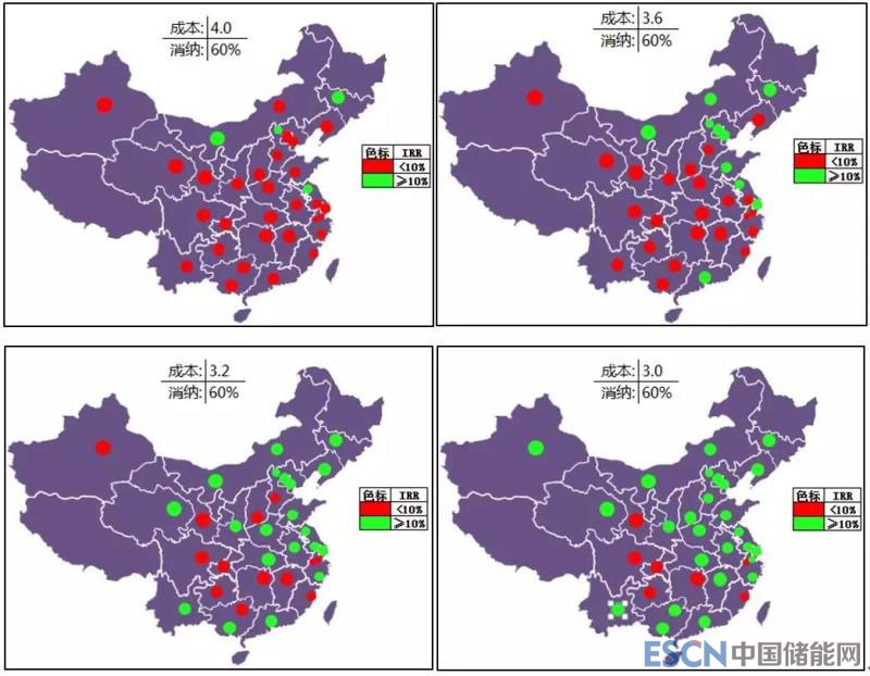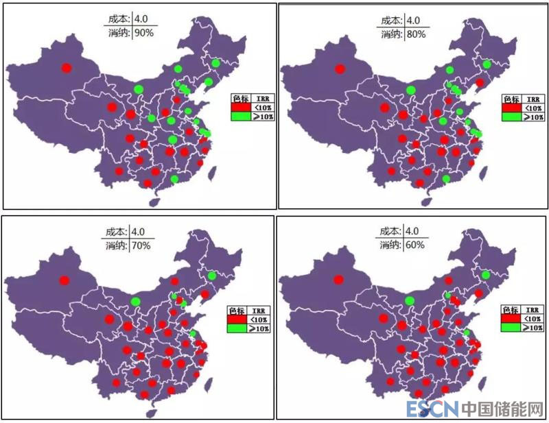 60%自用比例下有4個(gè)的城市(地區(qū))滿足收益率要求,蒙西、冀北、長(zhǎng)春、連云港。