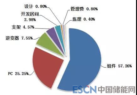 光伏電站建設(shè)成本主要包括開發(fā)費(fèi)用、勘察設(shè)計(jì)費(fèi)用、施工費(fèi)用,以及主材設(shè)備如光伏組件、逆變器、支架等。下圖為我公司蘇南某項(xiàng)目復(fù)盤報(bào)告中的項(xiàng)目初始投資成本構(gòu)成,其中光伏組件費(fèi)用占比高達(dá)57%。顯然,當(dāng)前光伏成本能否的大幅下降主要受制于組件成本。
