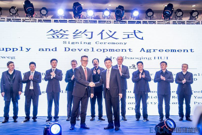 儀式上,寶馬集團副總裁Mr. Uwe Breitweg(分管動力總成系統(tǒng)商業(yè)客戶事業(yè)部)、江蘇寶航能源儲能戰(zhàn)略合作伙伴代表百威集團全球原料采購副總裁Mr. Matthew Frost,先后發(fā)表了熱情洋溢的講話,對即將進行的合作信心滿懷,并分別與江蘇寶航能源技術有限公司簽署了儲能戰(zhàn)略合作協(xié)議和儲能項目合作協(xié)議。