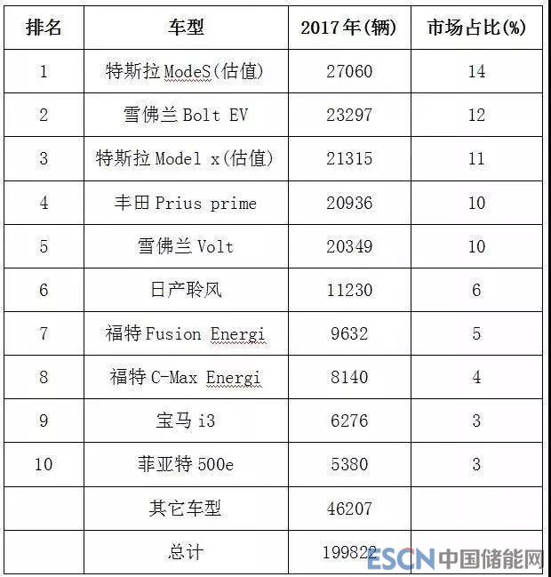 以美國2017年新能源汽車銷量前十為例。