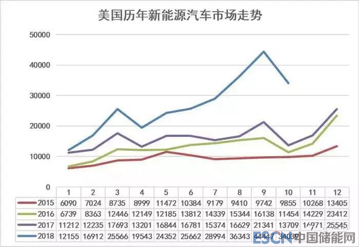 自2011年1月以來,美國市場已累計(jì)售出超過99萬輛電動(dòng)汽車,而僅在2018年第三季度就銷售了11萬輛電動(dòng)汽車,與2017年同期相比顯著增長了108%。從下圖2015年以來的美國新能源汽車走勢,也可以看到,當(dāng)?shù)匦履茉词袌霾⑽赐?