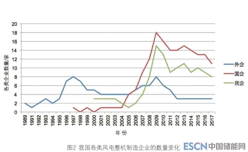 還有一個不可忽視的因素則是國 內(nèi)企業(yè)的迅速崛起。我國風電整機制 造企業(yè)的真正起步始于2000年左右, 此后數(shù)量緩慢增長,這也是國內(nèi)企業(yè) 對風電技術(shù)進行引進-消化-再創(chuàng)新 的關(guān)鍵期。在基本掌握相關(guān)技術(shù)的基 礎(chǔ)上,再加上國內(nèi)市場的蓬勃發(fā)展, 國內(nèi)風電整機制造企業(yè)從2005年迅速 增多,在2009年一度達到33家,此 后有所減少。從圖2可以看出,在國 內(nèi)風電整機制造企業(yè)中,國企和民企 的數(shù)量演變保持著大體相似的路徑。