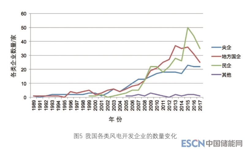 與整機制造企業(yè)數(shù)量變化走勢稍 顯不同的是,我國風電開發(fā)企業(yè)數(shù)量 整體上一直呈增長之勢。2003年前, 這些企業(yè)的數(shù)量不足10家。自此逐步增加,2010年首次突破60家,2015年更是超過了110家,此后有所減少。 在這些企業(yè)中,多為國內(nèi)企業(yè),外資企業(yè)鮮有參與。國內(nèi)企業(yè)又可以 進一步細分為由央企和地方國企組成 的國企、民企。2008年前,央企和地 方國企一直是我國風電開發(fā)的主體, 民企數(shù)量較少。2008年以來,民企迅 速增多,2009年、2010年首次超過 央企和地方國企。2015年,在我國風 電開發(fā)企業(yè)整體數(shù)量迅猛增長的情況 下,民企異軍突起,達到50家,在 數(shù)量上再次大幅超越央企和地方國企,2016-2017年一直保持這種態(tài)勢。