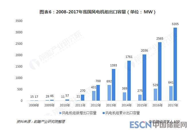 經(jīng)過多年的發(fā)展,我國風(fēng)電裝備制造企業(yè)的綜合實力有了大幅提升,具備了參與國際競爭的實力。2007年,我國首次由華儀風(fēng)能向智利出口了3臺780kW的風(fēng)電機組。2008年至2010年整機廠商陸續(xù)向其他國家出口,但是出口量都非常小,平均每年不到15MW。直到2011年,中國的風(fēng)電機組出口量猛增,突破200MW;2013年創(chuàng)新高,突破600MW。但在2014年和2015年,連續(xù)兩年同比出現(xiàn)下滑。2017年,我國風(fēng)電機組新增出口容量為641MW,累計出口容量為3205MW。