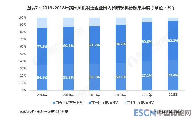 近5年,風(fēng)電整機制造企業(yè)的市場份額集中趨勢越發(fā)明顯。排名前五的風(fēng)電機組制造企業(yè)新增裝機市場份額由2013年的54.1%增長到2017年的67.1%,增長了13%;排名前十的風(fēng)電制造企業(yè)新增裝機市場份額由2013年的77.8%增長到2017年的77.8%增長到2017年的89.5%,增長了12%。