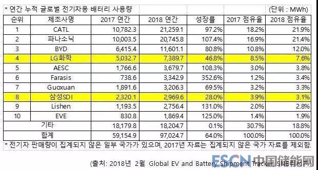 LG化學(xué)去年動(dòng)力電池出貨量為7.4GWh,同比增長46.8%,市場份額在7.6%,排名第四。另一家韓國企業(yè),三星SDI的出貨量是3.0GWh,同比增長28.0%,市場份額為3.1%。