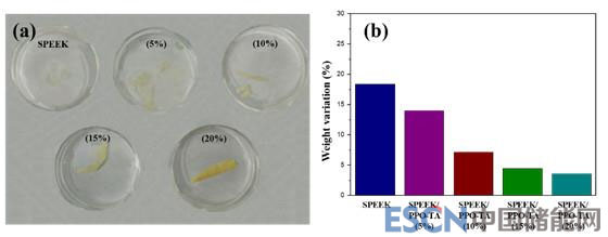 圖6.不同共混比的兩性膜經(jīng)過40天氧化之后的形貌受損和質(zhì)量損失