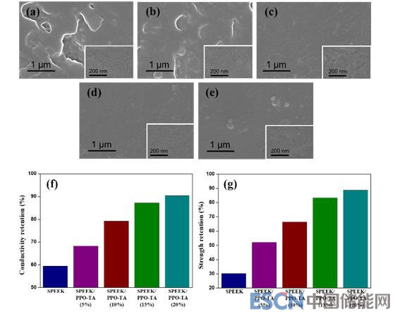圖5.不同共混比的兩性膜經(jīng)過14天氧化之后的表面微觀形貌受損以及電導(dǎo)率和機械性能的衰減