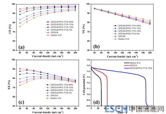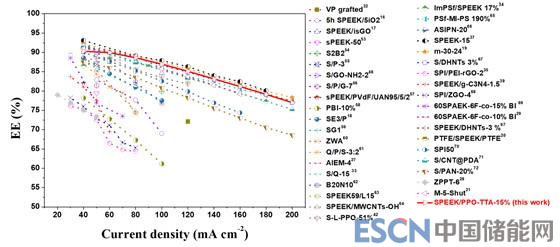 該團隊進一步對所制備的新型兩性離子交換膜的電池性能進行了測試并與常用的Nadion 212和SPEEK膜以及近些年報道的其余類型的兩性膜和SPEEK基質(zhì)膜進行了對比。研究結(jié)果表明,隨著叔胺基團含量的增加,由于基于酸堿對結(jié)構(gòu)和高效氫鍵網(wǎng)絡(luò)的高性能親水離子通道的建立,所制備的多叔胺型兩性離子交換膜所組裝電池在保持了優(yōu)異的電壓效率(VE)的同時其庫倫效率(CE)和能量效率(EE)獲得了顯著提升。在40~200 mA?2電流密度下,共混比為15%的兩性離子交換膜組裝的電池CE和EE分別可達94.3%~98.3%和90.3%~77.1%,并且經(jīng)過200次循環(huán)后沒有明顯降低。其性能遠優(yōu)于Nafion 212膜以及原始的SPEEK膜,并且在近年來報道的兩性膜以及SPEEK基質(zhì)膜中處于很高水平。該工作為離子交換膜傳導(dǎo)率和選擇性的平衡以及其高性能親水離子通道的設(shè)計提供了新的策略。