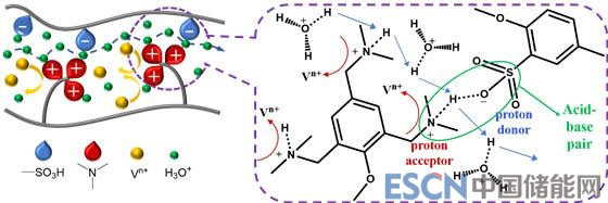 其傳導(dǎo)機理如下圖所示,該團隊利用叔胺基團作為質(zhì)子受體,與作為質(zhì)子供體的磺酸基團形成“酸堿對”結(jié)構(gòu)?!八釅A對”的氫鍵交聯(lián)網(wǎng)絡(luò)結(jié)構(gòu)縮小了膜的親水離子通道,有效降低了釩離子的滲透。同時,高效的氫鍵網(wǎng)絡(luò)結(jié)構(gòu)有助于質(zhì)子的傳導(dǎo),保證了其優(yōu)異的質(zhì)子傳導(dǎo)能力。除此之外,未形成“酸堿對”的叔胺在酸性環(huán)境中可結(jié)合質(zhì)子并帶正電荷,進一步促進了氫鍵網(wǎng)絡(luò)的構(gòu)建,增強了質(zhì)子的傳導(dǎo),阻礙了釩離子的滲透。
