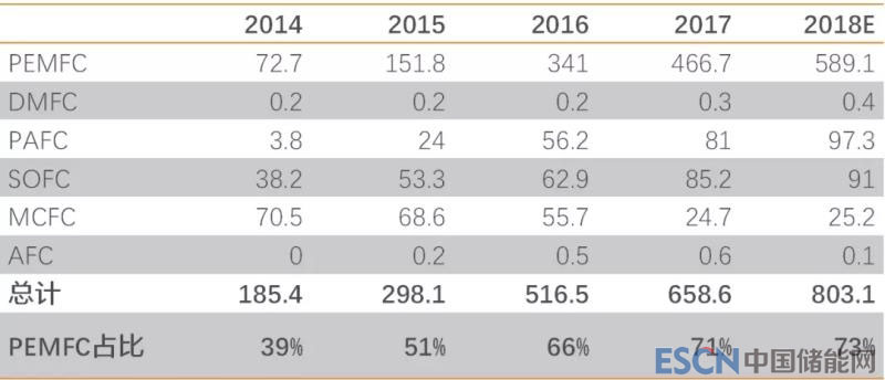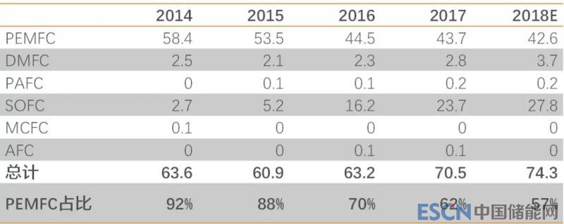 表4 2014-2018年按種類全球燃料電池出貨量(兆瓦)