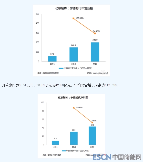 寧德時代最近三年的營業(yè)收入、凈利潤及資產(chǎn)規(guī)模快速增長。2015年-2017年,公司營業(yè)收入分別為57.03億元、148.79億元及199.97億元,年均復合增長率高達87.26%。