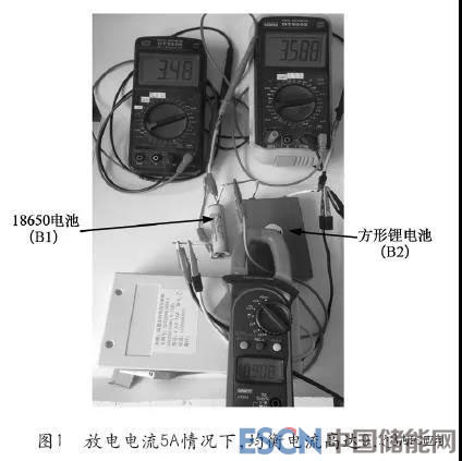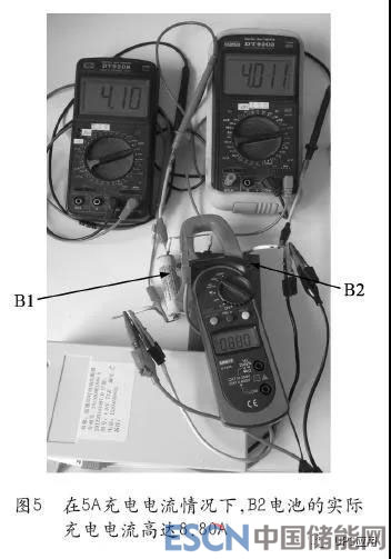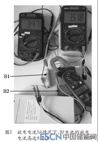 圖1所示的為實(shí)驗(yàn)裝置電池組,18650電池(B1電池)的容量只有1Ah,藍(lán)色方形電池(B2電池)的容量高達(dá)11Ah,容量差高達(dá)10Ah,相差10倍,當(dāng)前總放電電流5A,鉗形電流表下面的裝置是本文所述高效大功率均衡器樣機(jī),采用的是獨(dú)創(chuàng)的“雙向同步整流技術(shù)”(見(jiàn)附件“影響電池均衡電流和均衡效率的瓶頸及解決方案——雙向同步整流技術(shù)”),在均衡器的介入下,均衡電流則高達(dá)9.08A(存在測(cè)量誤差,下同),如圖1所示;方形鋰電池的實(shí)際放電電流高達(dá)9.82A,如圖2所示;而18650電池的實(shí)際放電電流只有0.87A,如圖3所示,在強(qiáng)大均衡電流的作用下,最大電壓差只有0.11V,至放電結(jié)束,兩塊電池的電量全部放完,并且18650電池的放電電壓仍在安全電壓值以內(nèi)。
