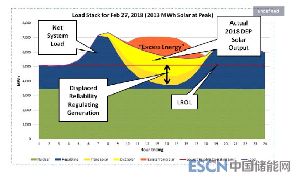 例如,主要服務(wù)于北卡羅來納州和南卡羅萊納州東部客戶的杜克能源發(fā)展公司(DEP),在2017年管理著高達(dá)106GWh的過剩能源,這些主要來自北卡羅萊納州大量的公用事業(yè)規(guī)模太陽能發(fā)電設(shè)施。當(dāng)凈需求負(fù)荷低于最低可靠運(yùn)行極限(LROL)時(shí),就會(huì)產(chǎn)生“過剩能量”。這往往發(fā)生在一天中太陽能發(fā)電量最大的時(shí)期,即上午10點(diǎn)到下午3點(diǎn)之間,如圖所示。