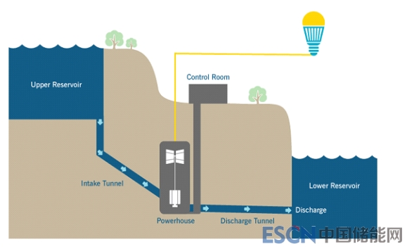 如圖所示,抽水蓄能發(fā)電的概念很簡單。利用上游水庫和下游水庫兩個(gè)水庫,采用兩用渦輪機(jī)構(gòu)成抽水蓄電設(shè)施。當(dāng)多余的電能輸送到泵房時(shí),大型電機(jī)驅(qū)動(dòng)水輪機(jī),將下游水庫的水泵送到上游水庫,從而存儲潛在的能量供日后使用。當(dāng)需要獲取存儲的能量時(shí),這個(gè)過程就會(huì)逆轉(zhuǎn),水流就會(huì)驅(qū)動(dòng)渦輪發(fā)電機(jī)發(fā)電。