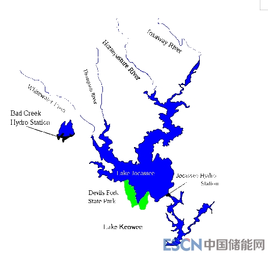 圖中顯示了杜克能源公司的兩個(gè)抽水蓄能設(shè)施的位置和布局。其中較大和較新的一個(gè)設(shè)施是1991年開通運(yùn)營的Bad Creek抽水蓄能發(fā)電設(shè)施。其附近的Jocasee水電站于1975年建成,并作為一個(gè)抽水蓄能項(xiàng)目運(yùn)行,近年來更換升級了更強(qiáng)大的渦輪機(jī)。這兩個(gè)地點(diǎn)的可用儲能量大大超過了美國公用事業(yè)規(guī)模電池儲能項(xiàng)目的總裝機(jī)容量,預(yù)計(jì)2018年的裝機(jī)容量約為750MW。