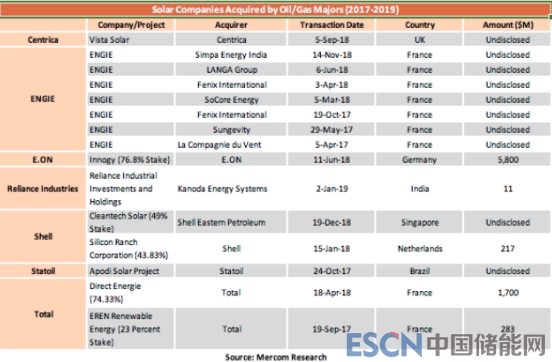 Mercom表示,石油行業(yè)對(duì)太陽能行業(yè)最大單筆投資是來自德國(guó)意昂集團(tuán)在2018年6月斥資58億美元收購(gòu)可再生能源公司Innogy的76.8%股份。其次是法國(guó)道達(dá)爾公司,以7億美元投資Direct Energie,持股74.3%。
