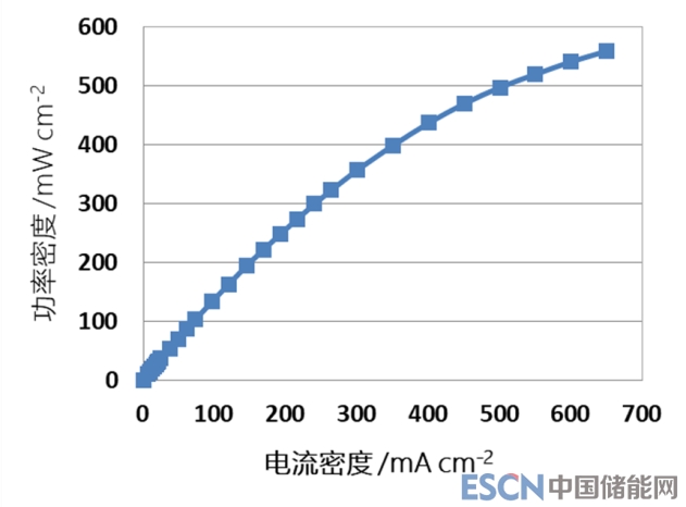低碳院開發(fā)的高功率密度液流密度液流電池電堆照片及測試結(jié)果。典型的千瓦級液流電池功率密度超過500 mW cm-2,高于同級別傳統(tǒng)液流電池2-3倍,實(shí)現(xiàn)電堆的小型化和材料的高效化,具備明顯的低成本優(yōu)勢。