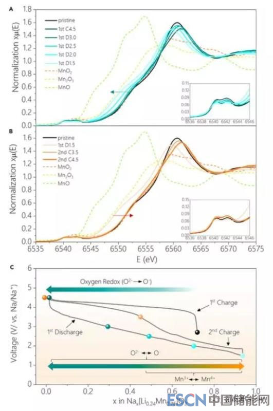 近日,發(fā)表在國際知名期刊Joule上的一篇文章《AnionicRedox Reaction-Induced High-Capacity and Low-Strain Cathode with SuppressedPhase Transition》中國科學(xué)家就為我們展示了O元素在正極材料中穩(wěn)定的進(jìn)行氧化還原反應(yīng)的可能性【4】。在這篇文章中,來自中科院物理所的Xiaohui Rong等人合成了具有P2結(jié)構(gòu)的Na0.72(Li0.24Mn0.76)O2鈉離子電池正極材料,該材料的可逆容量達(dá)到210mAh/g,通過對該材料在充放電過程中的Mn元素K邊X射線吸收結(jié)構(gòu)研究表明,當(dāng)材料在2.5V-4.5V進(jìn)行充放電時,材料中的Mn元素價態(tài)沒有發(fā)生顯著的改變,表明該過程的氧化還原反應(yīng)主要是有O元素完成的,這也使得材料的可逆容量達(dá)到210mAh/g以上,遠(yuǎn)遠(yuǎn)超過了Mn3+/Mn4+反應(yīng)所能提供的容量。