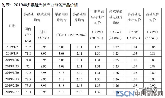 從各企業(yè)生產(chǎn)情況看,1-2月份檢修企業(yè)包括新特能源(小型局部維護)、四川永祥(小型局部維護)、鄂爾多斯、天宏硅業(yè)、內(nèi)蒙東立,截止2月底,除天宏硅業(yè)和內(nèi)蒙東立外均恢復(fù)正常生產(chǎn)。保利協(xié)鑫旗下江蘇中能硅業(yè)改良西門子法多晶硅產(chǎn)能維持6萬噸/年產(chǎn)能正常運行;硅烷流化床法5000噸/年顆粒硅項目運行逐步完善,月產(chǎn)量在400噸左右;新疆協(xié)鑫6萬噸/年多晶硅月產(chǎn)量逐步提升,達產(chǎn)率已經(jīng)達到50%以上。通威股份旗下四川永祥1月份進行小型維護,產(chǎn)量影響300噸左右,2月初恢復(fù)正常生產(chǎn);內(nèi)蒙古通威2.5萬噸產(chǎn)能于2018年10月底投產(chǎn)運行,從11月份開始逐步釋放產(chǎn)量,月產(chǎn)量逐漸增加,截止2月底已基本達到滿產(chǎn)運行;永祥新能源也成功于12月底投產(chǎn)運行,2月份有少量產(chǎn)出。新特能源1月份小型維護,產(chǎn)量幾乎不受影響,新建3.6萬噸/年產(chǎn)能預(yù)計3月份量產(chǎn)。新疆大全新增1萬噸/年擴產(chǎn)項目于2018年10月底投產(chǎn)運行,到年底前已基本達產(chǎn),另外5000噸/年去瓶頸化項目也于2019年1月份完成,截止2月份產(chǎn)能達到3.5萬噸/年。東方希望一期二線1.5萬噸/年產(chǎn)能逐步釋放,一期3萬噸/年產(chǎn)能達產(chǎn)率約80%。