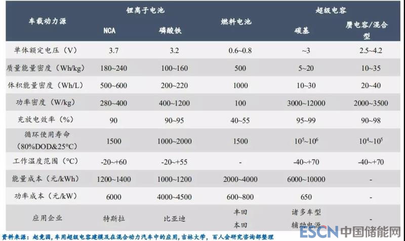 與鋰離子電池和燃料電池相比,超級電容器具有其獨特的技術(shù)性能。目前在新能源汽車領(lǐng)域主要應(yīng)用的鋰電池與燃料電池的功率密度、循環(huán)壽命還較低,單獨作為動力源時不可避免地存在一些局限性,比如純電動汽車高速行駛下耗電量增加等問題。與此相比,超級電容器的功率密度高,并且其循環(huán)壽命、低溫性能優(yōu)越,能較好地適應(yīng)汽車的長期運(yùn)行工況和特殊氣候使用場景,但作為單獨(或主要)車用動力源時能量密度過低、成本極高,并沒有得到大規(guī)模普及。
