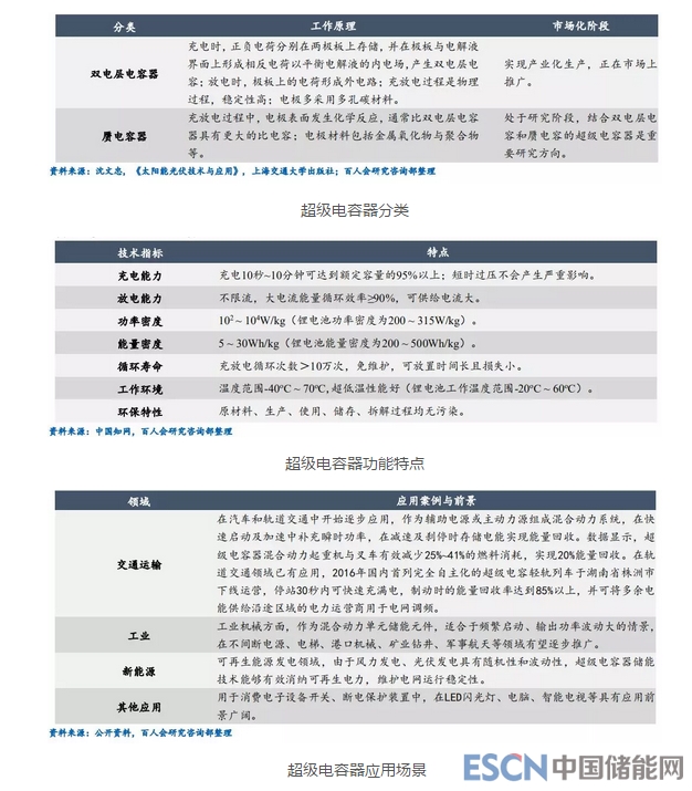 超級電容器是一種功率型儲能方案,兼具電池和電容的特性。超級電容器結(jié)合了普通電容器和可充電電池的特點,具有充電速度快、充放電不限流、功率密度高、循環(huán)使用壽命長、能量轉(zhuǎn)換效率高等優(yōu)勢。根據(jù)不同的工作原理,可分為雙電層電容器和贗電容器兩種,目前雙電層電容器技術(shù)相對更為成熟,在市場上逐步推廣。