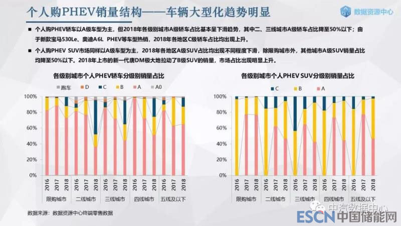 個(gè)人消費(fèi)市場(chǎng)PHEV銷量占比30%,高于整體市場(chǎng)占比,個(gè)人消費(fèi)者對(duì)于PHEV的購(gòu)買意愿相對(duì)更強(qiáng)。A級(jí)轎車和A級(jí)SUV是個(gè)人PHEV市場(chǎng)的主力車型,隨著新款寶馬530Le、新一代唐DM、WEY P8等產(chǎn)品上市,這一系列車型或?qū)⑼苿?dòng)個(gè)人PHEV產(chǎn)品結(jié)構(gòu)向大型化轉(zhuǎn)移,并且這一現(xiàn)象在二線及以下城市更為明顯。