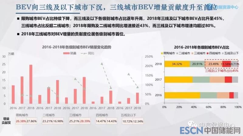 BEV在新能源技術(shù)進(jìn)步、消費(fèi)者觀念改變以及政策推動(dòng)等因素影響下開(kāi)始向三線及以下級(jí)別城市下沉,該部分市場(chǎng)占比2018年提升至45%,而一線限購(gòu)城市占比持續(xù)下降;同時(shí)三線城市占比反超二線城市,對(duì)BEV增量的貢獻(xiàn)度也位居各級(jí)別城市首位。增速方面,2018年三線及以下城市增速超過(guò)80%,遠(yuǎn)高于一二線城市的43%。
