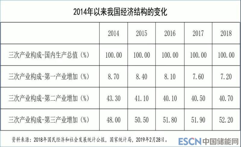 一定時期的經(jīng)濟結(jié)構(gòu)是能源效率的主要決定因素,其中高耗能的第一和第二產(chǎn)業(yè)是決定能源消費總量和效率的關(guān)鍵行業(yè)。近年來,中國的經(jīng)濟結(jié)構(gòu)在持續(xù)進行優(yōu)化調(diào)整,具體表現(xiàn)為第三產(chǎn)業(yè)在國民經(jīng)濟中所占的比重在不斷增大,而高耗能的第一和第二產(chǎn)業(yè)比重在下降。2014年以來的五年間,第三產(chǎn)業(yè)在國民經(jīng)濟中所占的比重增加了4.2個百分點。