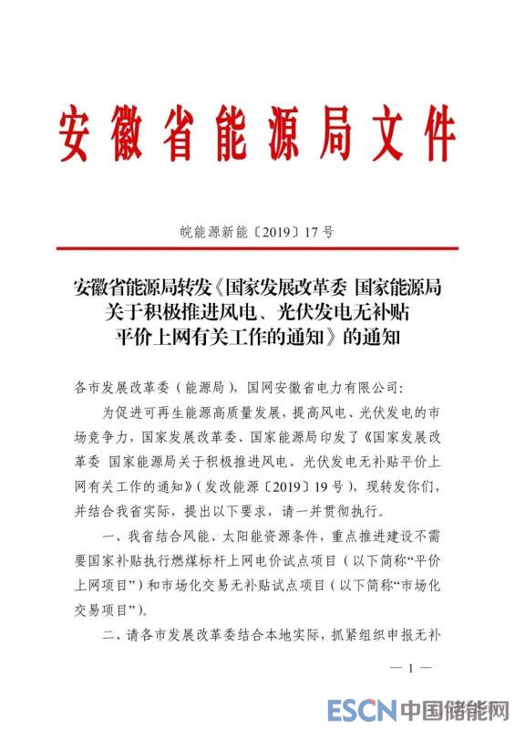 中國儲能網(wǎng)訊:安徽能源局印發(fā)皖能源新能〔2019〕17號 《安徽省能源局轉(zhuǎn)發(fā)《國家發(fā)展改革委 國家能源局關(guān)于積極推進(jìn)風(fēng)電、光伏發(fā)電無補(bǔ)貼平價(jià)上網(wǎng)有關(guān)工作的通知》的通知》,要求各市發(fā)展改革委于 2019 年 3 月 20 日前將本市平價(jià)上網(wǎng)項(xiàng)目報(bào)送省能源局,省能源局將會同相關(guān)部門,研究確定平價(jià)上網(wǎng)項(xiàng)目名單,市場化交易項(xiàng)目按國家有關(guān)規(guī)定申報(bào)確認(rèn)。