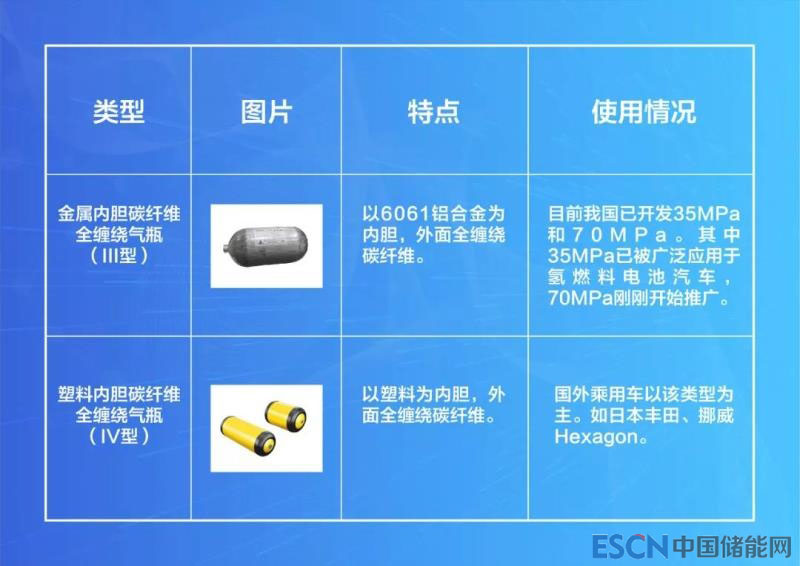 其中,儲(chǔ)氫瓶相當(dāng)于傳統(tǒng)燃油車的油箱,其儲(chǔ)氫量有如油箱儲(chǔ)油量。目前,國(guó)內(nèi)外主流儲(chǔ)氫瓶為高壓氣態(tài)瓶,國(guó)內(nèi)使用Ⅲ型瓶(金屬內(nèi)膽碳纖維全纏繞氣瓶),國(guó)外使用Ⅳ型瓶(塑料內(nèi)膽碳纖維全纏繞氣瓶)。