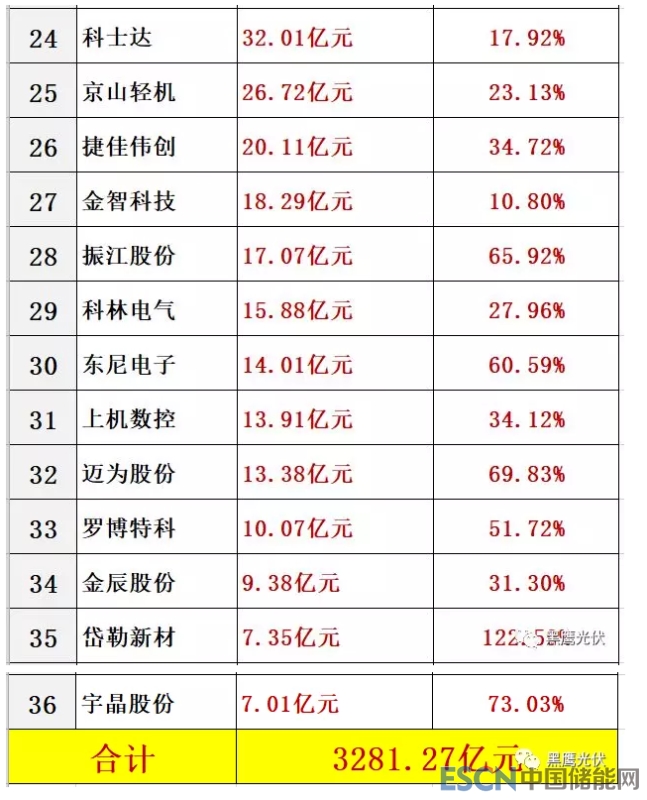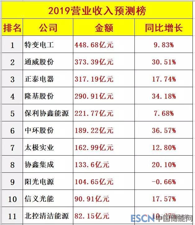 據(jù)第三方研究機(jī)構(gòu)預(yù)測(cè)及黑鷹光伏統(tǒng)計(jì),2019年這36家光伏上市公司是營(yíng)業(yè)收入總計(jì)3281.27億元,9家公司營(yíng)收將在百億以上,其中榜單前三名為特變電工、通威股份和正泰電器,預(yù)計(jì)三者2019年?duì)I業(yè)收入將分別達(dá)到448.68億元、373.39億元和317.19億元;