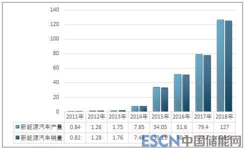 隨著國家陸續(xù)出臺新能源汽車補(bǔ)貼政策,我國新能源汽車銷量大幅增長,2014年銷量7.48萬輛,2015年銷量33.11萬輛,2016年銷量50.70萬輛, 2017年,新能源汽車產(chǎn)銷分別完成79.4萬輛和77.7萬輛,同比分別增長53.8%和53.3%。其中,純電動汽車產(chǎn)銷分別完成66.7萬輛和65.2萬輛,同比分別增長59.8%和59.6%;插電式混合動力汽車產(chǎn)銷分別為12.8萬輛和12.4萬輛,同比分別增長28.5%和26.9%。2011-2018年,我國新能源汽車產(chǎn)銷量如下圖所示: