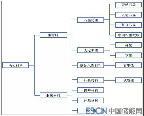 從目前的負(fù)極材料的種類來看,按照材料的組分,通??梢詫囯姵刎?fù)極材料分為2大類:碳材料和非碳質(zhì)材料。碳材料負(fù)極進(jìn)一步分類為天然石墨負(fù)極、人造石墨負(fù)極、中間相碳微球(MCMB)、軟炭(如焦炭)負(fù)極、硬炭負(fù)極、碳納米管、石墨烯、碳纖維等;其他非碳負(fù)極材料主要分為硅基及其復(fù)合材料、氮化物負(fù)極、錫基材料、鈦酸鋰、合金材料等。
