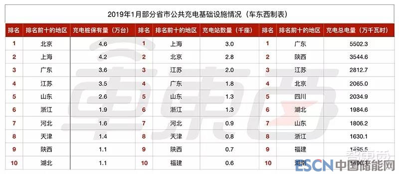 不過(guò)在充電總電量上,集中化的趨勢(shì)似乎發(fā)生了一些改變,在充電樁保有量以及充電站數(shù)量上均位居第九的陜西以3544.6萬(wàn)度充電總電量躍升到了第二位,廣東與江蘇則分別以5502.3萬(wàn)度和2812.7萬(wàn)度的充電量位居第一、第三,北京2019年1月新能源基礎(chǔ)設(shè)施充電量為2065萬(wàn)度,排在第四位,而上海則索性從榜單上消失。