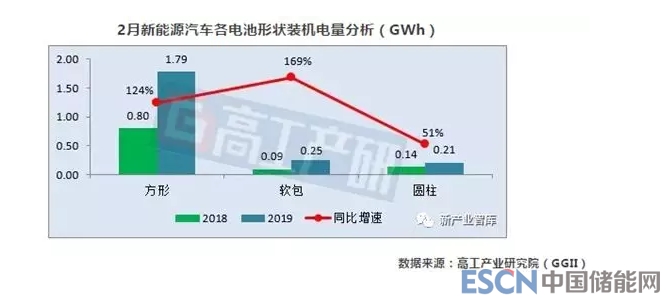 從不同電池形狀來看,2019年2月方形電池裝機電量約1.79GWh,同比增長124%;軟包電池裝機電量約0.25GWh,同比增長169%;圓柱電池裝機電量約0.21GWh,同比增長51%。