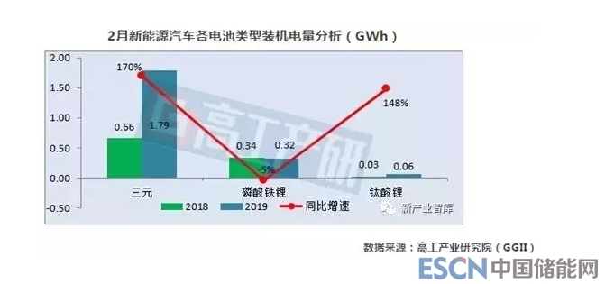 從電池類型來看,2019年2月磷酸鐵鋰電池裝機電量約0.32GWh,同比下降5%;三元電池裝機電量約1.79GWh,同比增長170%;鈦酸鋰電池裝機電量約0.06GWh,同比增長148%。