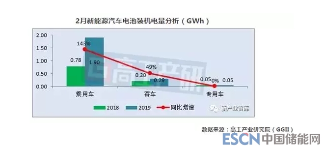 從車輛細分類別來看,2019年2月新能源乘用車電池裝機電量約1.90GWh,同比增長143%;客車電池裝機電量約0.29GWh,同比增長49%;專用車電池裝機電量約0.05GWh,與去年同期相比基本持平。