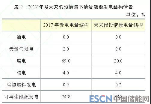 當(dāng)前我國(guó)電源結(jié)構(gòu)仍以化石能源發(fā)電為主,2017年煤電發(fā)電量占總發(fā)電量的69%。作為對(duì)比,本文假設(shè)未來(lái)清潔能源發(fā)電結(jié)構(gòu)下煤電電量占比下降至20%,可再生能源發(fā)電占比提高到73.8%,見(jiàn)表 2。