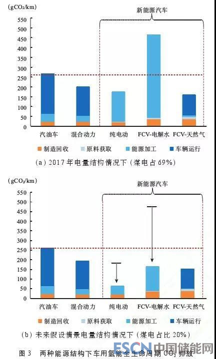 與電能相似,氫能利用的環(huán)境影響取決于上游一次能源結(jié)構(gòu)和下游應(yīng)用場(chǎng)景,其中上游一次能源結(jié)構(gòu)隨著可再生能源占比的提高而動(dòng)態(tài)變化,而氫的能源化利用集中在以燃料電池發(fā)電為主的車用能源和分布式能源場(chǎng)景。因此本文以氫燃料電池汽車為例,分析當(dāng)前和未來(lái)清潔電源情況下,燃料電池汽車的全生命周期排放,并與內(nèi)燃機(jī)汽油汽車、混合動(dòng)力汽車、純電動(dòng)汽車技術(shù)路線進(jìn)行對(duì)比。