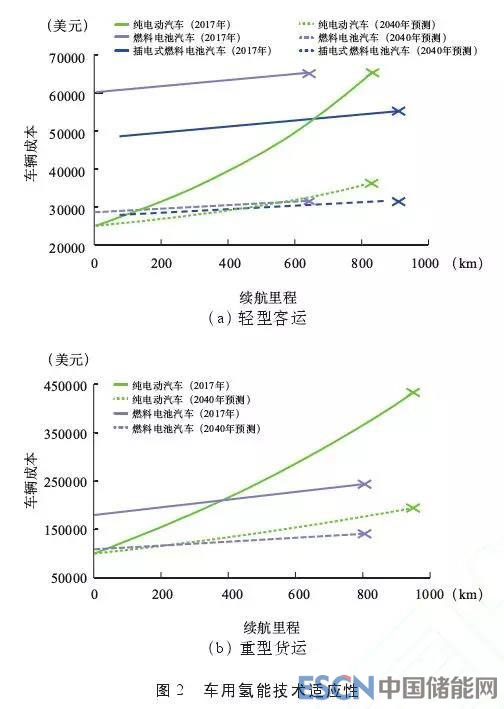 雖然目前氫能以工業(yè)原料消費(fèi)為主,但未來(lái)交通部門應(yīng)用潛力巨大。燃料電池功率和儲(chǔ)能單元彼此獨(dú)立,增加能量單元對(duì)車輛成本和車重影響相對(duì)較小,氫燃料電池在重型交通領(lǐng)域相比鋰電池具有更強(qiáng)的技術(shù)適應(yīng)性。圖 2 為氫燃料電池汽車和純電動(dòng)汽車在輕型客車(圖 2a)和重型貨車(圖 2b)應(yīng)用中的成本對(duì)比,可見(jiàn)隨著車重和續(xù)航的提升,燃料電池汽車成本將逐步接近甚至低于純電動(dòng)汽車。