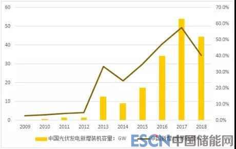 圖2 2009—2018年中國光伏發(fā)電新增裝機(jī)容量及占世界新增的比重