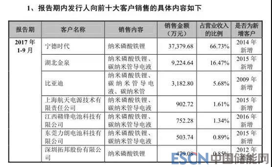 2017年1-9月,德方納米是寧德時(shí)代磷酸鐵鋰正極材料的第一大供應(yīng)商,是比亞迪碳納米管導(dǎo)電液的第一大供應(yīng)商,贛鋒電池、力朗電池、拓邦股份、湖北金泉也是其主要客戶,客戶集中度較高。