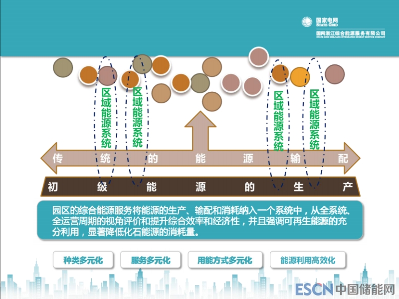 綜合能源,可能這個名詞大家一直能聽到,各個省市已經(jīng)成立了綜合能源服務(wù)公司,綜合能源服務(wù)以后的主要站場在哪里?肯定在園區(qū),工業(yè)園區(qū)或者其他的一些相關(guān)的政治園區(qū),用能量主要在這塊,園區(qū)的綜合能源服務(wù)將整個生產(chǎn)的輸配和消耗納入一個系統(tǒng)中,從全系統(tǒng)、全流程或者全應(yīng)用周期提高綜合效率和經(jīng)濟(jì)性,而且要顯著降低化石能源的消耗量?,F(xiàn)在我們國家提倡綠水園區(qū),希望園區(qū)創(chuàng)造低炭園區(qū)。在園區(qū)里面可能服務(wù)種類多樣化,能源供應(yīng)種類也多樣化,特別是分布式能源也會多樣化,這樣的話我們儲能技術(shù)在這里面會有高效利用或者有效利用。