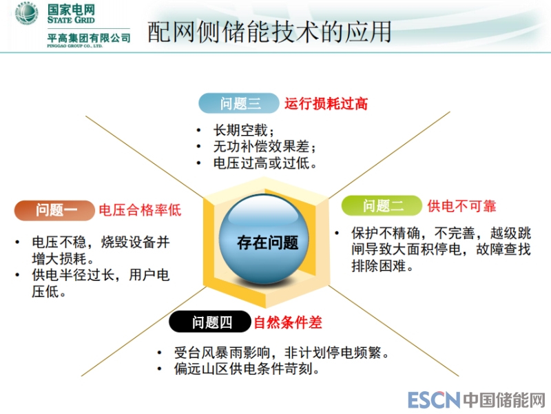 配網(wǎng)側(cè)儲(chǔ)能技術(shù)的應(yīng)用。一是配網(wǎng)末端,從能量守恒來說,發(fā)的電不管是火力、水利,無非就是通過輸電要配出去,現(xiàn)在國(guó)內(nèi)每年花大量的資金進(jìn)行配網(wǎng)改造,一是跟經(jīng)濟(jì)有關(guān),二是配網(wǎng)的利用率比較低。一個(gè)就是電網(wǎng)合格率低,第二個(gè)供電不可靠,第三運(yùn)行損耗過高,第四自然條件差。