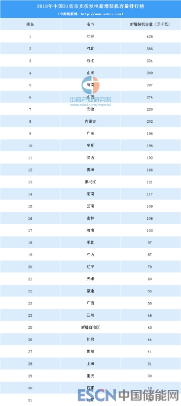 分地區(qū)來看,2018年全國光伏發(fā)電新增裝機(jī)容量排名第一的省市為江蘇省,新增裝機(jī)容量達(dá)425萬千瓦,排名前十省市依次為江蘇、河北、浙江、山東、河南、山西、安徽、內(nèi)蒙古、廣東、寧夏。